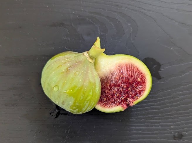 イチジクは非常にユニークな紫/緑の外観でゴージャスでした. 内部は赤色で、非常にシロップ状でジャミーです。いちごジャムとメープルシロップの濃厚な味わいでとても甘いです。テクスチャーは非常に厚くて緻密で、歯ごたえのある素晴らしい肌をしています。