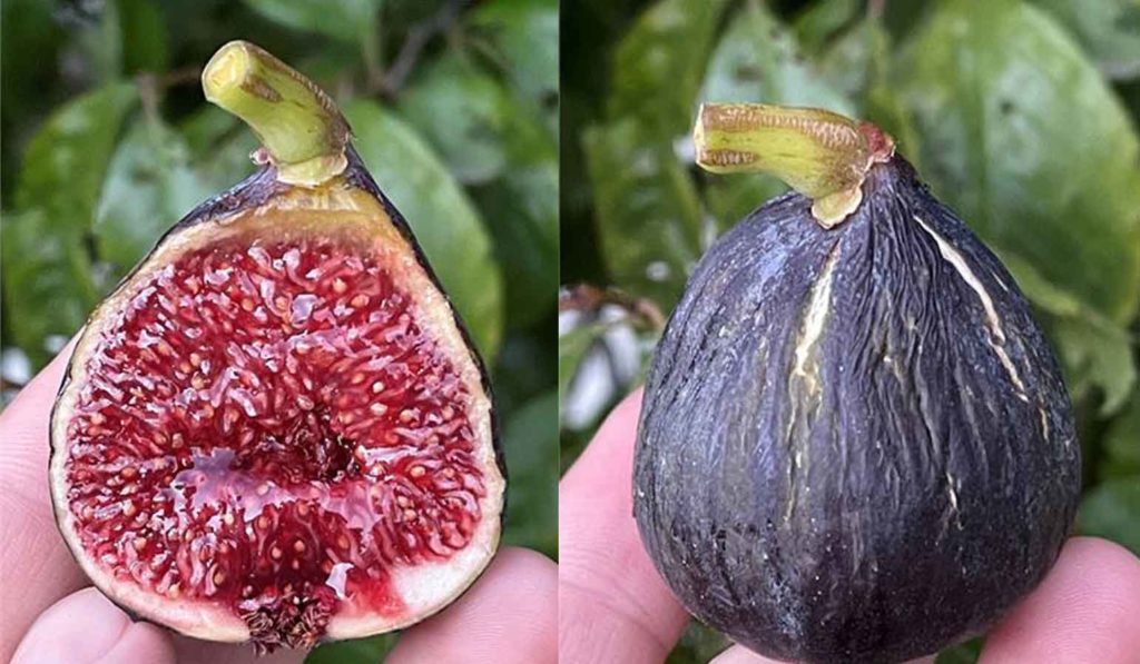 - 果実は、40gほどの中程度の大きさで、果皮は濃い紫色で、果肉は淡い赤~深紅です。